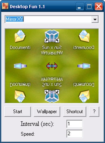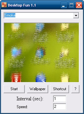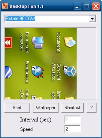Desktop Fun ti permette di personalizzare alcuni parametri. Puoi scegliere l'intervallo di tempo prima che gli "scherzi" entrino in azione e la velocità da dargli. Ci sono anche due pulsanti interessanti: uno trasforma l'effetto in uno sfondo per il desktop e l'altro permette di creare un collegamento rapido sul desktop a uno di essi. Per chi è un professionista degli scherzi e ha in mente qualcosa di molto perfido e raffinato.
